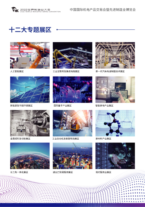 本次展會設置十二大專題展區:人工智能展區、工業互聯網及集成電路展區、新一代汽車先進制造技術展區、新能源及節能環保展區、國際量子產業展區、智能家電產業展區、金屬成形及切削展區、工業自動化及智慧物流展區、新材料產業展區、長三角一體化展區、進出口貿易服務展區、現代服務業展區。