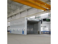 整體移動式噴漆房的設(shè)計目的,是為了滿足較大型工件打磨或噴漆的需要。一般情況下每套房體對應2-3個排風凈化工位,哪個工位上的工件需要噴漆時,房體則行走移動到那個工位,其他工位可以繼續(xù)打磨工作,待房體內(nèi)的工件噴漆完畢后,再控制移動房體行走到打磨完畢的工件工位,如此設(shè)計可以實現(xiàn)大型工件的不間斷連續(xù)噴漆工作。房體為鋼結(jié)構(gòu)構(gòu)造,房體立柱下面設(shè)置有兩臺電動驅(qū)動行走機構(gòu),行走機構(gòu)沿地面軌道行走。移動房體兩端設(shè)置有電動卷簾大門,房體行走時,大門升起,待到達指定位置時,大門降落關(guān)閉。大門與行走機構(gòu)由電氣控制部分連鎖控制,大門完全升起后,房體才可移動行走。了解更多關(guān)于噴漆房價格,歡迎與我們公司取得聯(lián)系,獲取方案及報價,咨詢,微信/手機:13655437136